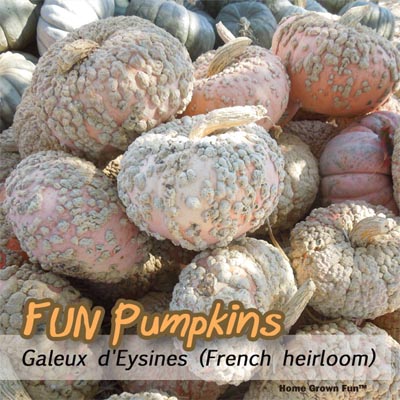 This one’s not just for display! It’s an all-around “eater”. They make tasty pies, baked goods, chips and soups. Its name is derived from Eysines, a small town in southwestern France. The word “Galeux” means mangy. This phrase creatively gets translated as “embroidered with warts from Eysines”. Compare pumpkins. The more peanut-looking growths, the sweeter it will be. Sugar coming to the surface as it ripens makes the fantastic, textured bumps.