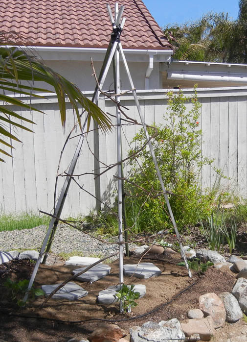 TIP – Once the vines start growing, you can help them attach themselves to the poles by gently tying them close to the poles with loose twine, string or even sections of pantyhose. Put those ugly knees highs to good use!