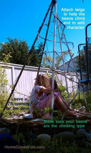 See this massive bean teepee in progress from GSO Edible Schoolyards for an example. Your bean teepee could be covered completely by mid summer.