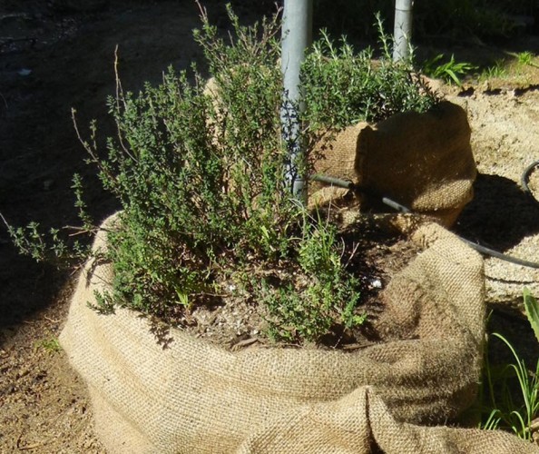 Recycled coffee sacks make great planting containers because they look natural, drain well and can be composted later. I don’t need permanent garden containers. The bottoms of these sacks will rot out if I don’t put a barrier down but that’s ok with me. Makes herb gardening easy, fun and beautiful.