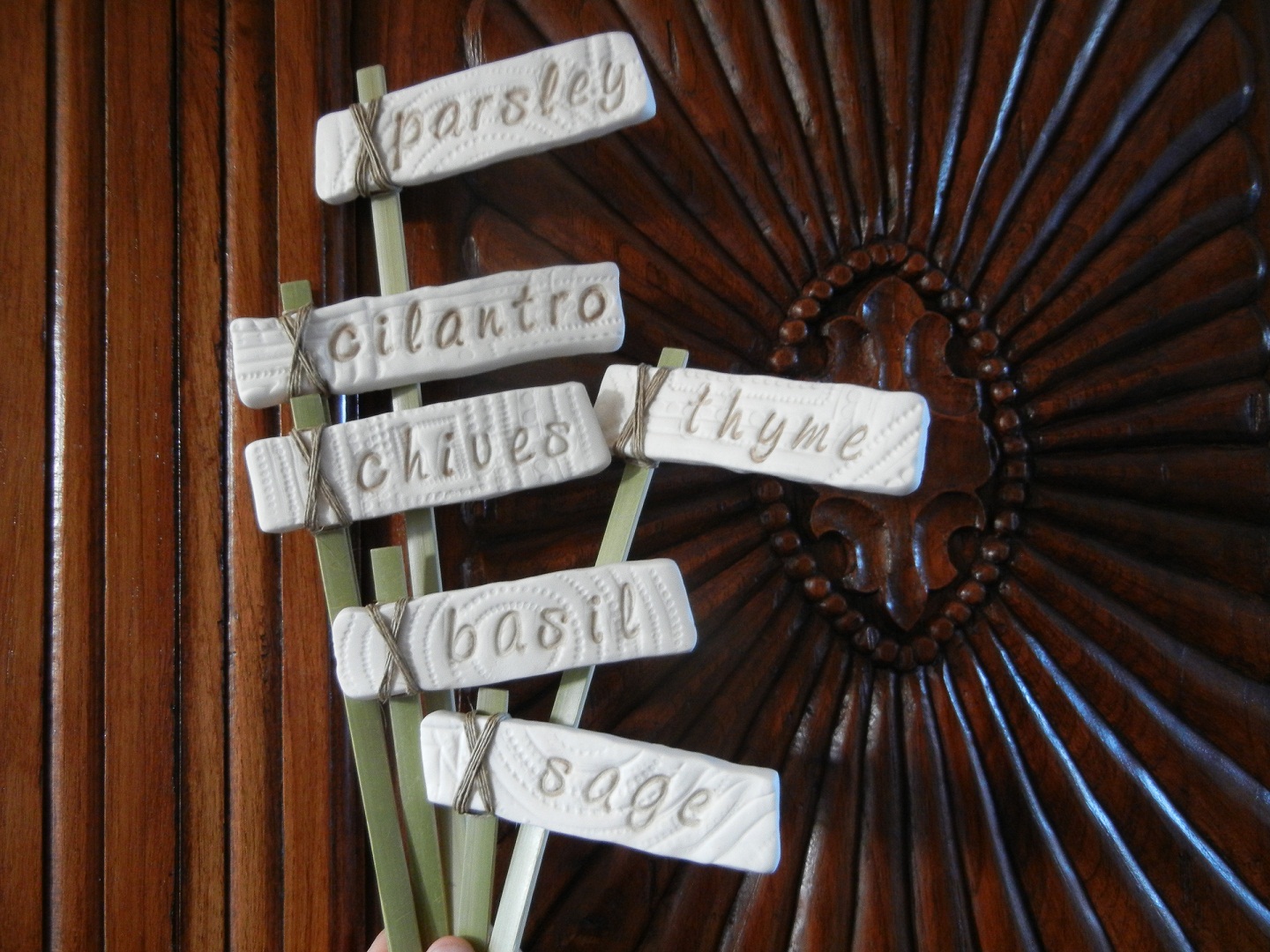 LETTERING: Press stamps into the clay to emboss the names of vegetables and herbs. Take a fine pointed paintbrush and create a light, watery wash of acrylic paint. I used a watered down burnt umber. Brighter colors didn’t look as natural. Carefully brush the paint into the impressions and wipe away any extra pigment with a damp cloth.