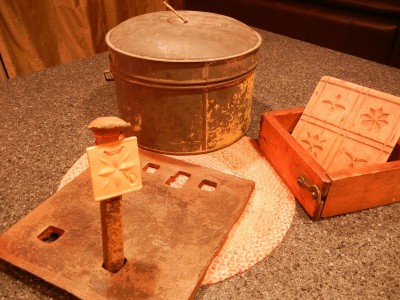 DESIGN IDEAS: After some experimentation, I ended up using an antique butter mold to make the tags. One quadrant of the mold worked well. I just smoothed out the edges before baking.