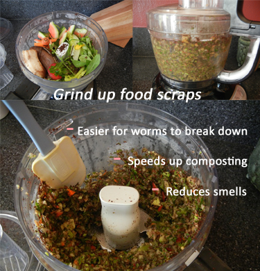 - SPOIL ‘EM ROTTEN: If you really want to make brats out of your worms, chop up their food. This isn’t necessary but it speeds things up. Your bin may be completed in record time by making it easier for the worms to break down the scraps. We use a food processor, bring the bowl directly into the garage and scoop out the ground food with a rubber spatula. You can also store chopped up food in the frig until ready to feed if you end up with extra.