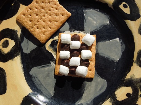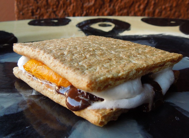 - Keep warm. You want them to give off some heat when you make the s’mores. Slip one pumpkin square in the middle of a s’more in between the marshmallow and chocolate. At home, without a campfire, we start with a graham cracker, then layer dark chocolate chips and small marshmallows in an alternating pattern, add the warm pumpkin and finally another graham cracker. The pumpkin should slightly melt the marshmallows and chocolate.