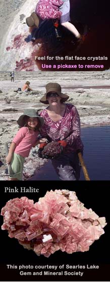 - Bring drinking water, hats, lip balm, sunscreen, rubber boots (hip waders even better), thick rubber gloves, thick regular gloves, strong buckets for each person, boxes and bags for the specimens, small shovels and picks for digging in the mud, large pickax for bringing down the pink halite from the ledges at the brine pools. Visit the Gem-O-Rama site for more information.